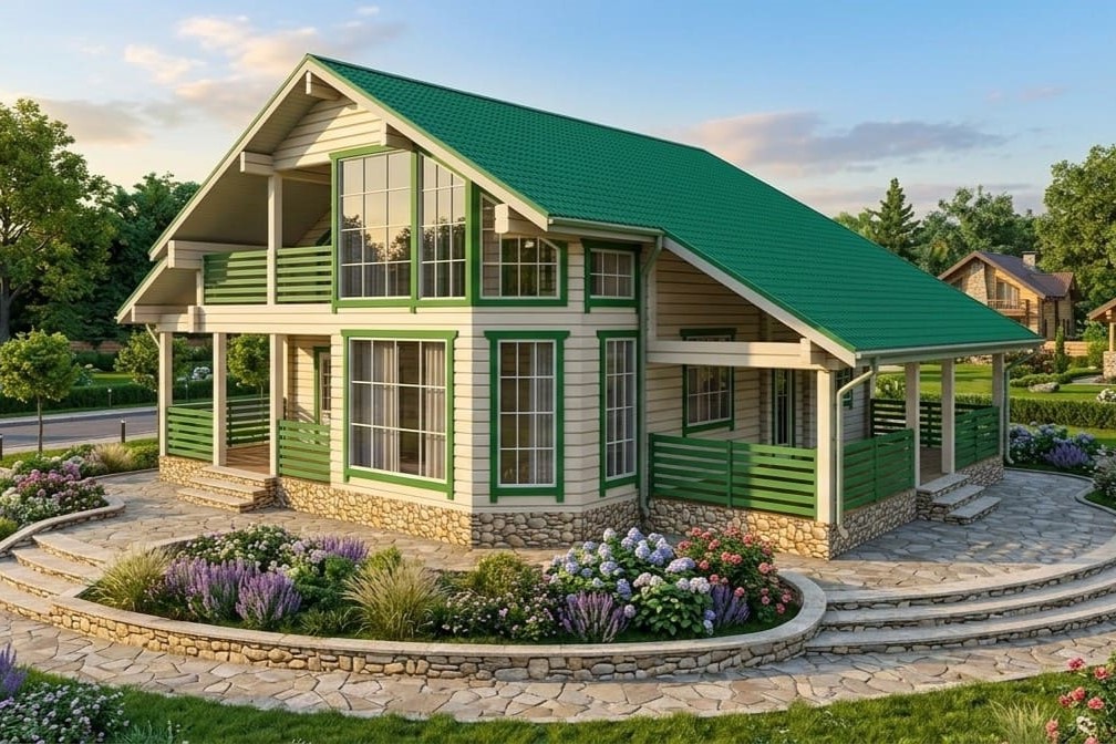 2 этажа, 4 спальни, 2 с/у, большая кухня и гостиная, библиотека, зимний сад, котельная
